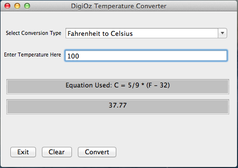 This is a Program that converts temperature between Fahrenheit, Celsius and Kelvin. To convert a temperature from one of the temperatures to the other, simply select the appropriate drop-down option, enter the temperature in the text field and hit Convert. The program includes a DMG installer that you will have to run to install the App.